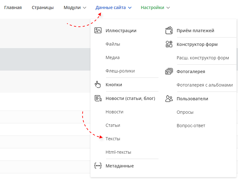 В меню данных сайта выберите пункт "Тексты".