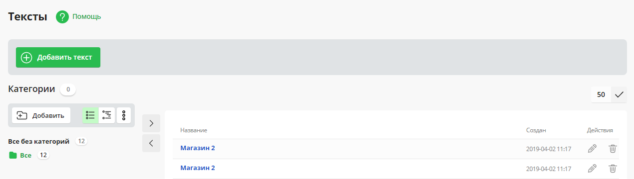 Откроется страница “Тексты”. Она содержит список всех имеющихся на сайте текстов.
