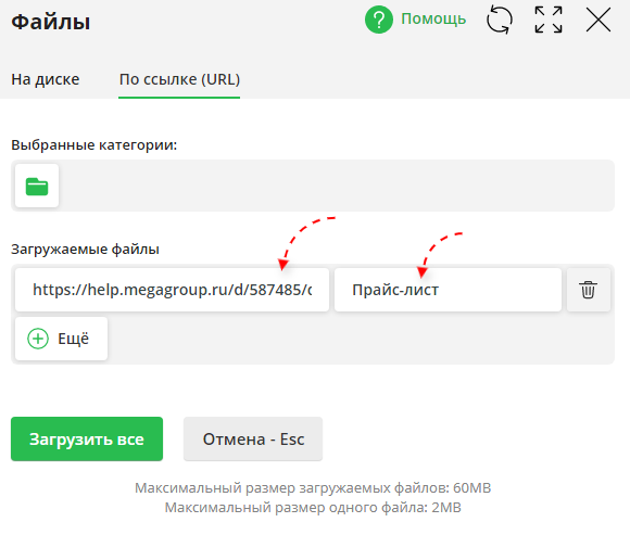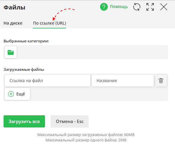 Если необходимо загрузить несколько файлов сразу, можно добавлять поля для ссылок кнопкой "+Еще".