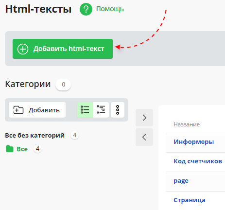 Для того чтобы добавить HTML-текст в систему управления, нажмите на ссылку “Добавить HTML текст” над списком.