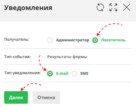 - По умолчанию (если уведомления еще не созданы) письма посетителям отправляются в зависимости от того, включена ли настройка "Отправлять письмо посетителю, заполнившему форму" в параметрах формы.