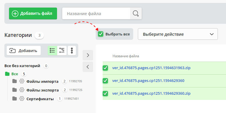 Для того чтобы отметить все файлы на странице каталога, воспользуйтесь галочкой "Выбрать" (она расположена в верхней части каталога над всеми файлами).