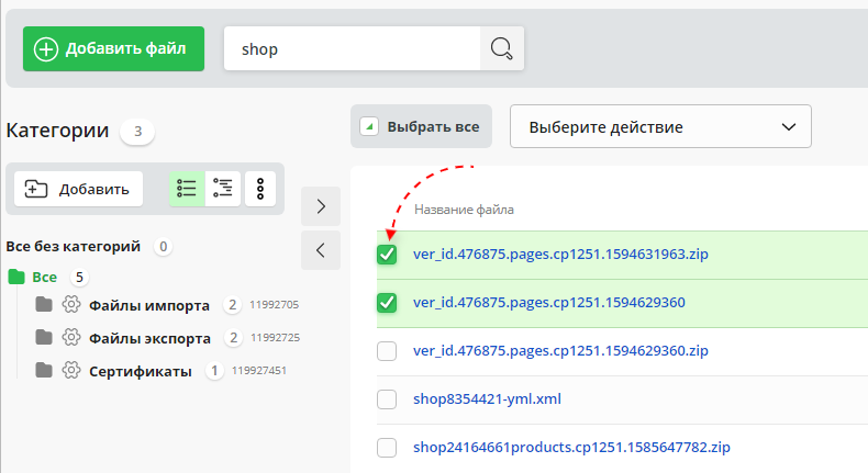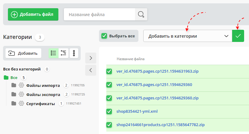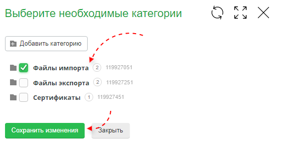 В открывшемся окне отметьте те категории, в которые необходимо добавить выбранные файлы, и нажмите "Сохранить изменения".