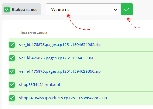 Вы можете удалить файлы с помощью групповых операций. Для этого отметьте файлы, которые планируете удалить, выберите пункт меню "Удалить" и нажмите "Применить".
