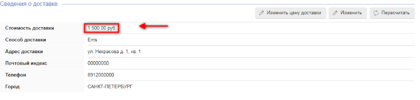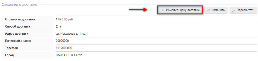 Оказавшись в окне просмотра заказа, мы переходим к разделу "Сведение о доставке" (он находится в том же окне). И чтобы изменить цену доставки, нажимаем на одноименную кнопку.
