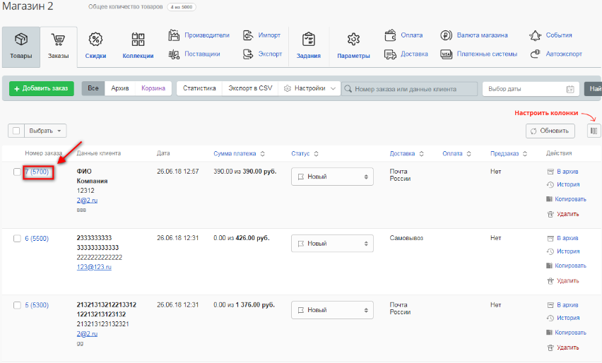 Для изменения стоимости доставки в уже сделанном клиентом заказе зайдите в "Магазин", выберите раздел "Заказы".