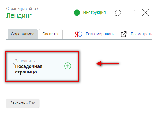 При нажатии в меню на выбранную посадочную страницу перед вами откроется диалоговое окно. Во вкладке "Содержимое" нажмите ссылку "Посадочная страница".