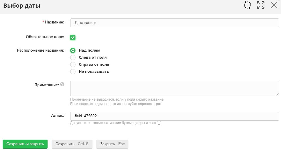 - Название - название поля, отображаемое на сайте.
