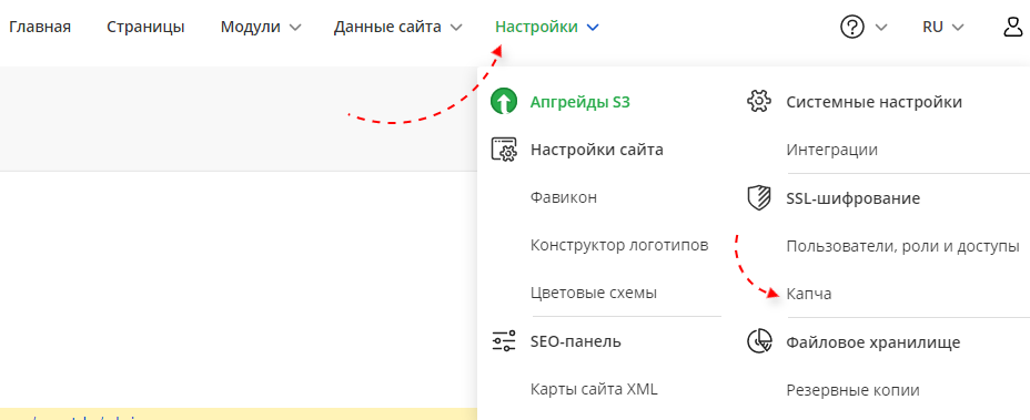 Раскройте меню "Настройки" и выберите пункт "Капча".