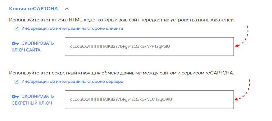 На открывшейся странице скопируйте значения из полей "Ключ" и "Секретный ключ".