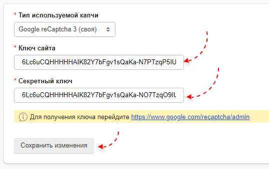 И вставьте их в системе управления в поля "Ключ сайта" и Секретный ключ" соответственно и сохраните изменения.