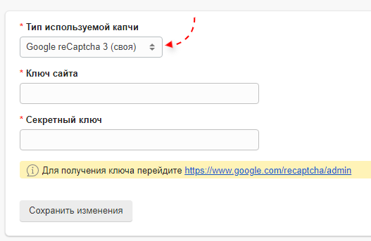 Если вы хотите самостоятельно настроить капчу, выберите тип "Google reCaptcha 3 (своя)".
