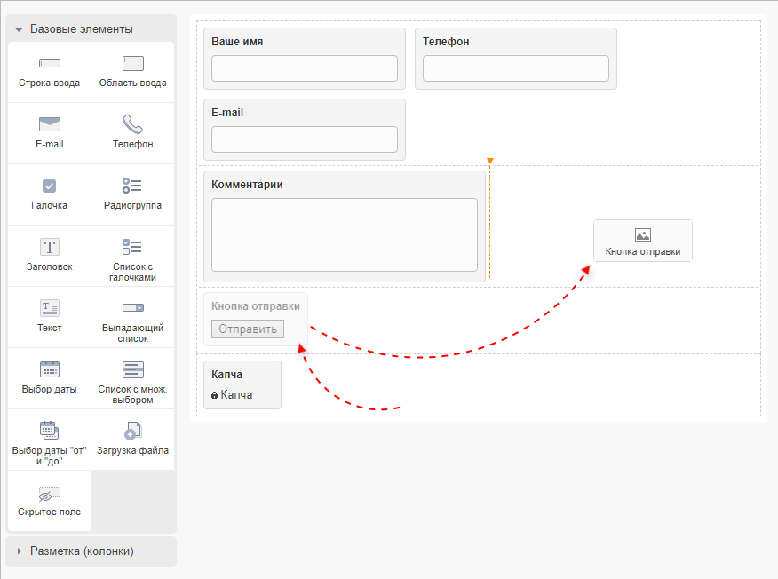 После того как вы создадите все необходимые поля в форме, вы сможете перемещать данную кнопку в любое удобное для вас место - над полями, в конец формы, в середину или рядом с одним из полей. Для этого достаточно навести курсор на кнопку, зажать левую кнопку мыши и перетащить кнопку в нужное место.