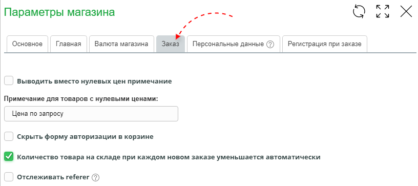 В "Параметрах магазина" перейдите на вкладку "Заказ".