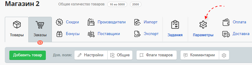 Чтобы задать такую настройку, войдите раздел в редактирования магазина и нажмите на ссылку "Параметры магазина".
