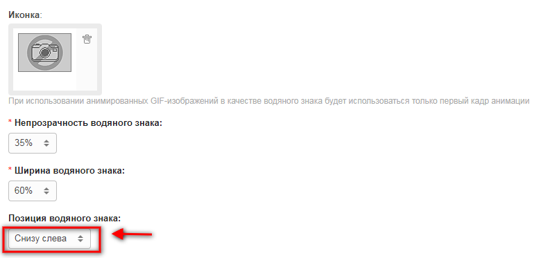- Если в качестве иконки водяного знака Вы выберите анимированное GIF-изображение, на картинки будет накладываться только первый кадр анимации.