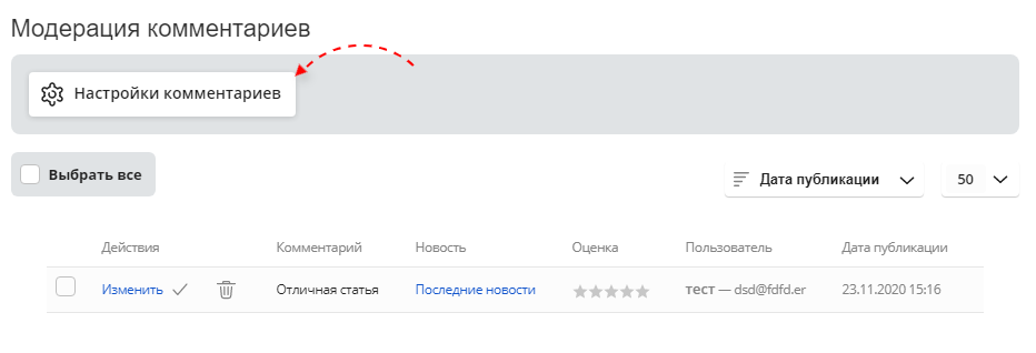 Вы можете включать/отключать комментарии к статьям и указывать для них параметры.