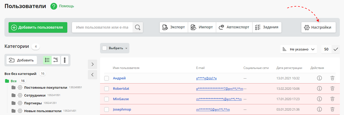 Чтобы изменить параметры пользователей, нажмите на кнопку "Настройки".