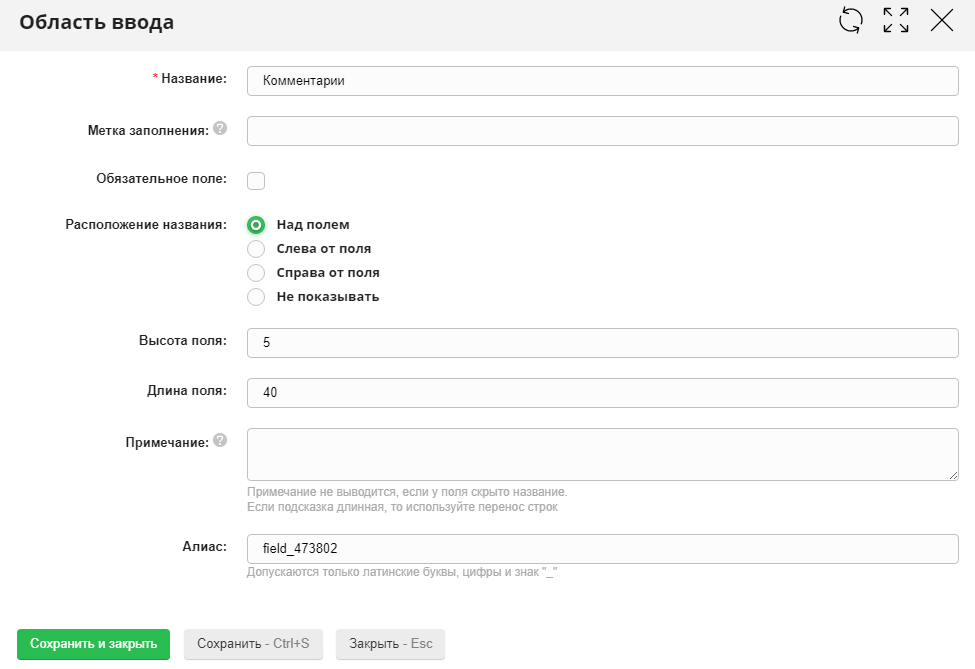 С помощью данного поля посетители сайта смогут оставлять более развернутые ответы на какие-либо вопросы или же оставлять свои пожелания и пр. При выборе поля "Область ввода", откроется окно свойств. Оно содержит поля: