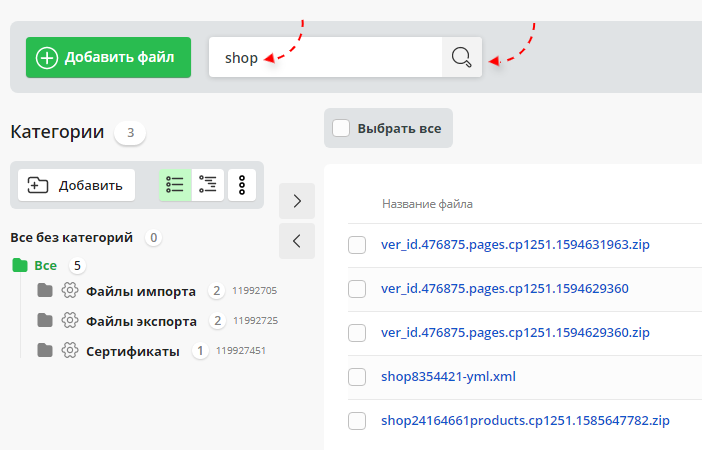 - При поиске по категории в результаты попадают только удовлетворяющие запросу файлы данной категории. Соответственно, при поиске по файлам без категорий ("Все без категорий" в дереве) в результаты попадут только подходящие файлы, не закрепленные ни за одной из категорий, а при поиске по всем файлам раздела (пункт "Все" в дереве) отобразятся все файлы раздела, удовлетворяющие запросу.