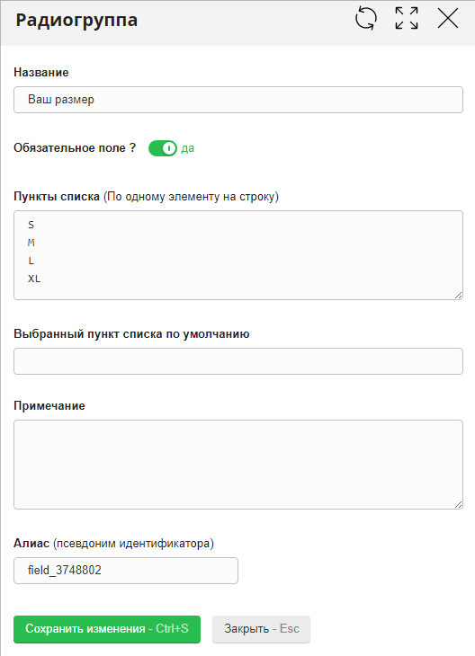 Главная / Редактирование сайта / Что такое данные сайта? / Конструктор форм / Добавление, изменение, удаление и сортировка полей в формах заявок / Поле "Радиогруппа"