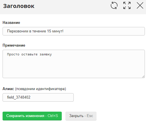 Главная / Редактирование сайта / Что такое данные сайта? / Конструктор форм / Добавление, изменение, удаление и сортировка полей в формах заявок / Поле "Заголовок"