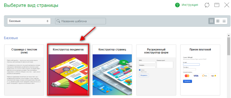 В открывшемся окне в категории "Товары и услуги" выберите вид страницы "Конструктор лендингов".