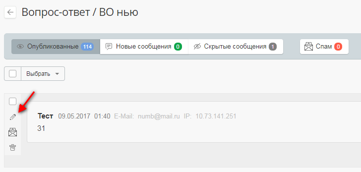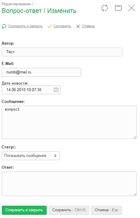Ответ - если сообщение пользователя содержит вопрос, администратор сайта может здесь вписать свой ответ. На сайте такое сообщение отобразится в формате "Вопрос - ответ".