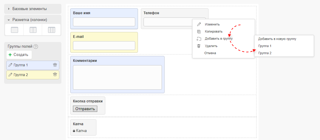 Вы можете добавить поле в групп, наведя курсор на поле и нажав на него. Далее в списке выберите "Добавить в группу".