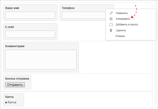 Скопировать поле можно, наведя курсор и нажав на нужное поле и в раскрывшемся списке выбрав "Копировать".