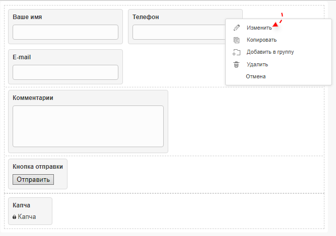 Чтобы внести изменения в параметры любого из полей, наведите курсор и нажмите на нужное Вам поле и в раскрывшемся списке выберите "Изменить".