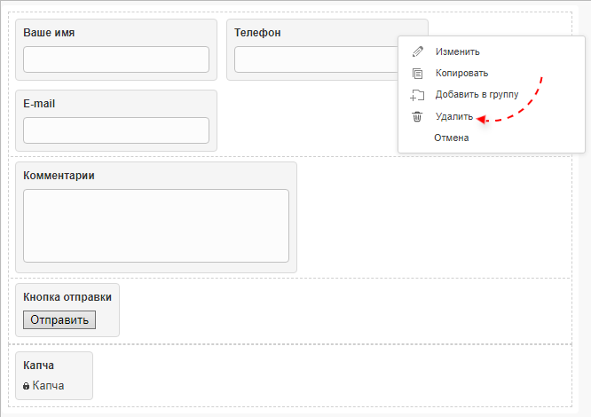 Для удаления поля наведите курсор и нажмите на нужное Вам поле и в раскрывшемся списке выберите "Удалить".