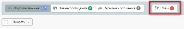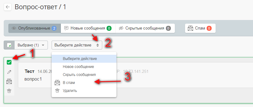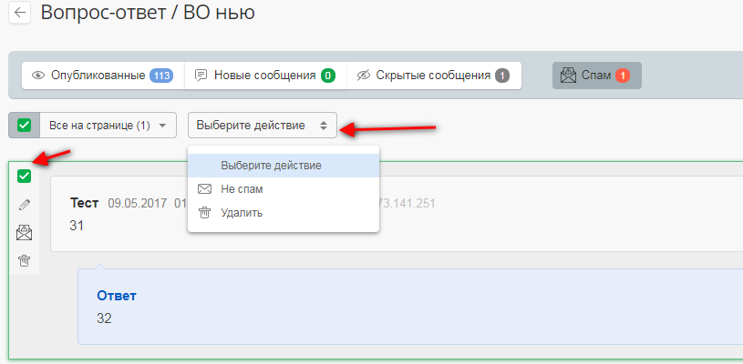 При необходимости Вы можете пометить любое сообщение в блоке как спам. В дальнейшем Вы можете работать с сообщениями, отправленными в спам: возвращать их в блок, изменять статус, публиковать, удалять и пр.