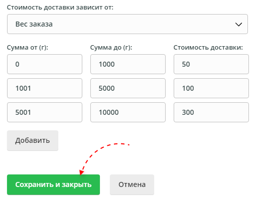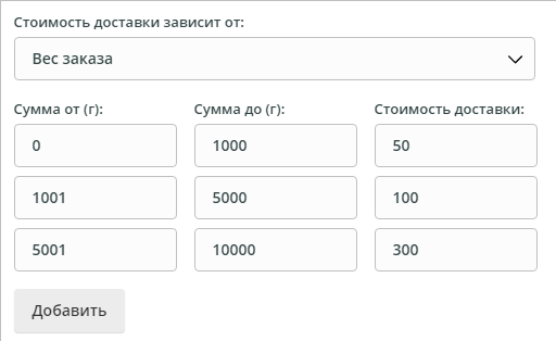 При необходимости вы можете создавать несколько условий. Для этого создайте еще одну строку с полями с помощью ссылки "Добавить". Таким образом, вы сможете создавать различные интервалы стоимости доставки, например, от 0г. до 1000г. = 100, от 1000г. до 5000г. = 200, от 5000г. до 10000г. = 250 и т.д.