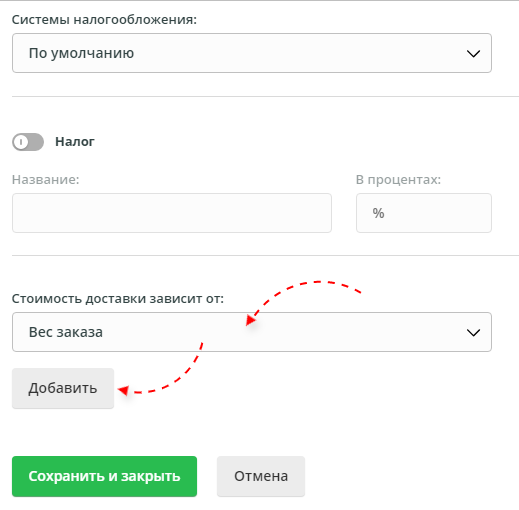 - В выпадающем списке "Зависимость стоимости доставки от" выберите пункт "Вес заказа",